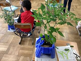 3時間目に早速観察をしました。「前に観察した時と比較して、葉、茎、花、実がどのくらい大きくなったのか、3つ以上は書けるといいね。」と伝えると、全員がこれまで以上に詳しく観察をすることができました。今日収穫できた子も数名。これからも生長が楽しみです!