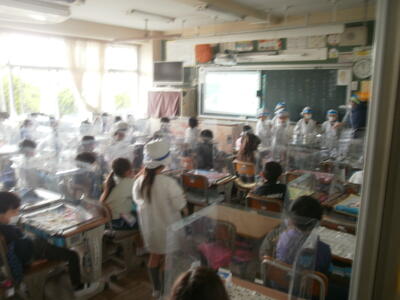 今日は1年生にとって入学して最初の給食でした。メニューはチキンカレーライス。技師に話を聞いたところ低学年用のカレーは辛さが甘めにしてあるそうです。一つ一つ手順を聞きながら準備をします。