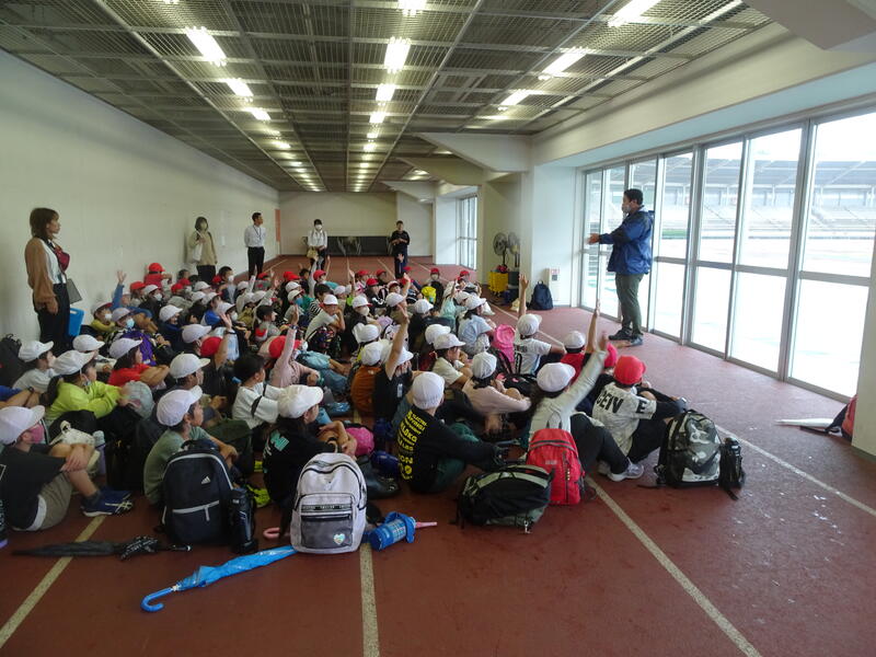 ここも普段は入れないアップ場。ここで競技場の職員の方から説明を受けます。質問にもこの反応。みんなよく勉強してきている!