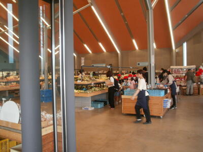直売所も見学させてもらいました。「たくさん野菜がある」「見たこともない野菜もあるね」
