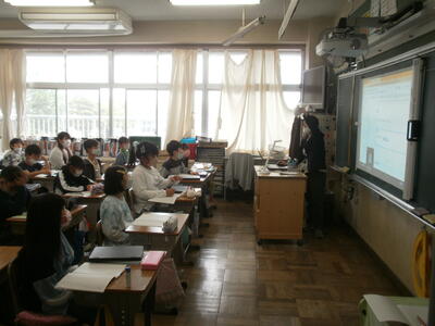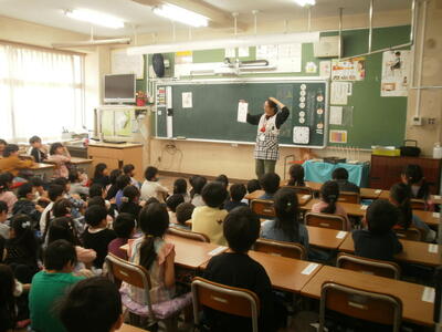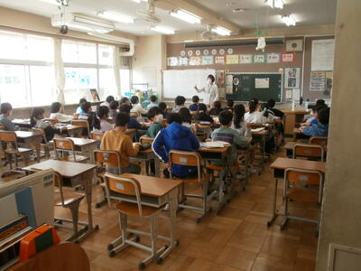 図書室を見ると4年生が学校図書館指導員の先生から授業を受けていました。