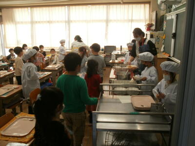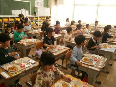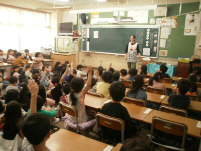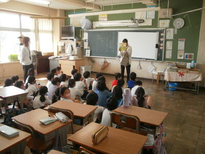 今日は1年生にとって小学校はじめての給食です。4時間目は栄養教諭の先生から給食についての説明を受けました。