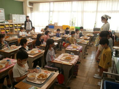 今日はチキンカレーライス。はじめての給食どうでしたか。
