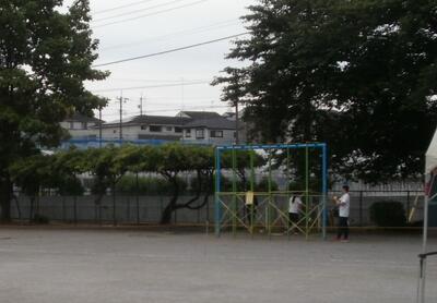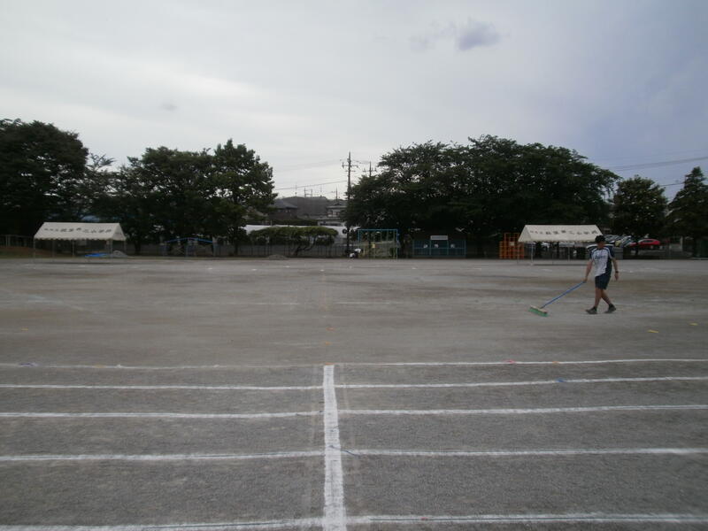 今回は係り児童にはテントを立てました。係り児童はほとんど休みがないためです。それ以外の児童は暑い場合は競技の合間にエアコンの効いた教室で涼をとるようにしました。