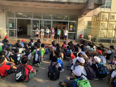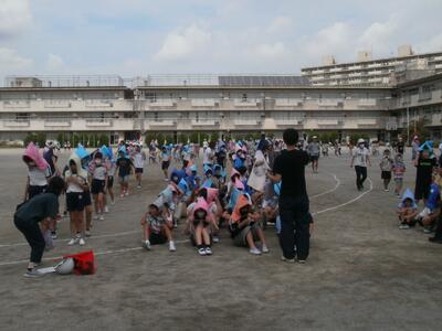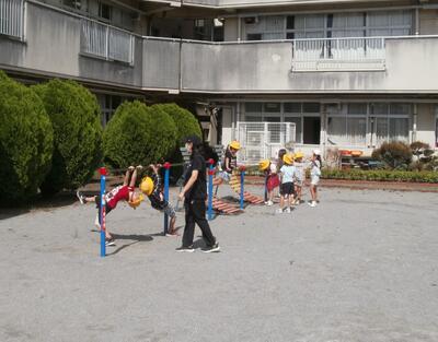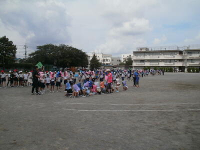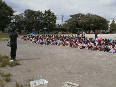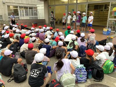 地震の想定なので防災頭巾をかぶって校庭に避難。