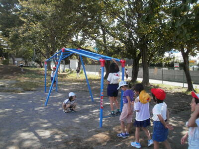 鉄棒で逆上がりを練習する子、豚の丸焼きを楽しむ子