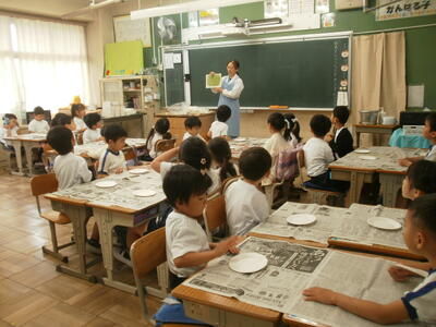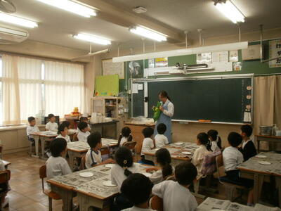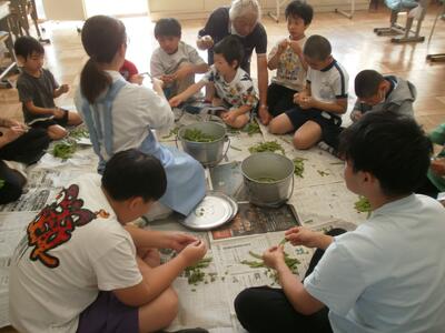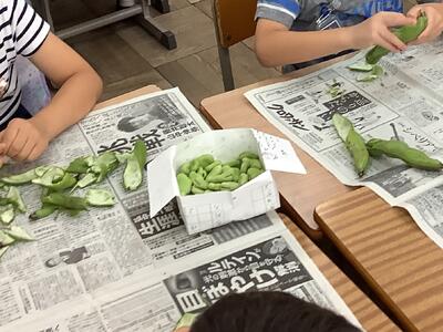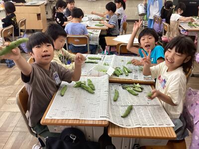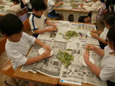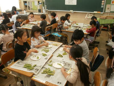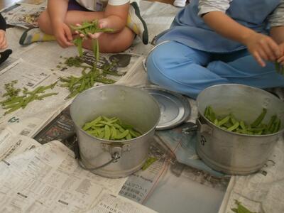 いつもは調理員さんたちが全校のみんなが食べる分のきぬさやの処理をしてくれますが、今日は自分たちでそれを体験しました。最初は「とれない」と言っていましたがすぐにみんな慣れてどんどんできるようになりました。
