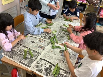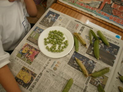 意外とグリンピースを知らない子も結構いました。自分も冷凍したものや缶詰では見たことがありましたがさやに入ったグリンピースを見たのは大人になってからでした。(見てはいたかもしれませんがグリンピースと意識はしていませんでした)