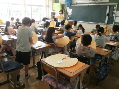 むき方を大きな見本で説明された後いざ、自分でむいてみます。