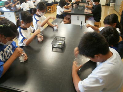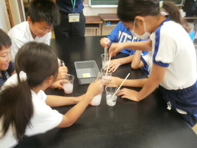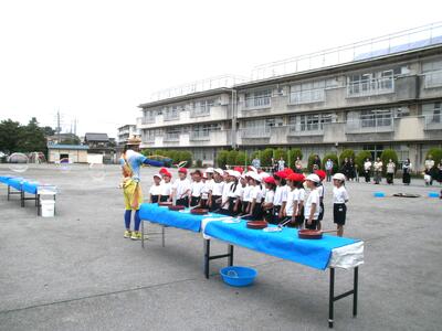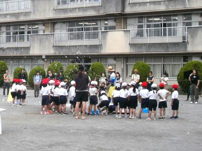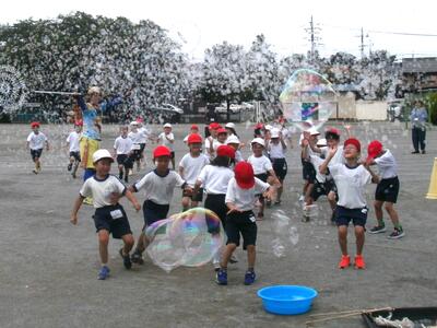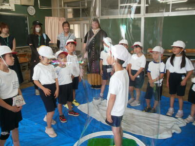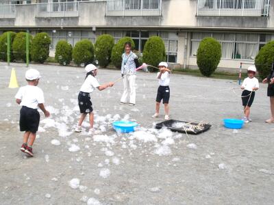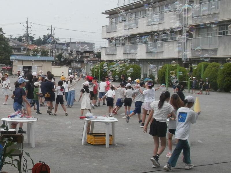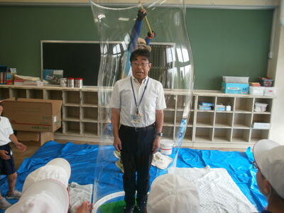 今日は1年生がシャボン玉教室を行いました。都合のつく保護者の方も一緒に参加しました。
