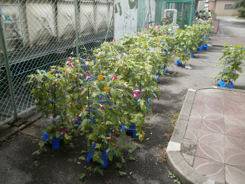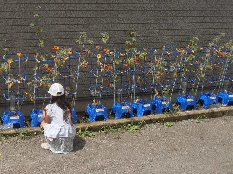 1,2年生の子どもたちが毎日忘れずにペットボトルで水をやって育てているアサガオとミニトマトがこんなに大きく育ちました。