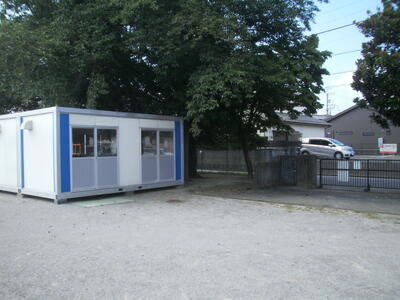 校庭側の門の脇には仮の体育倉庫が建ちました。今回の体育館の改修に伴ってこちらも立て直すためです。