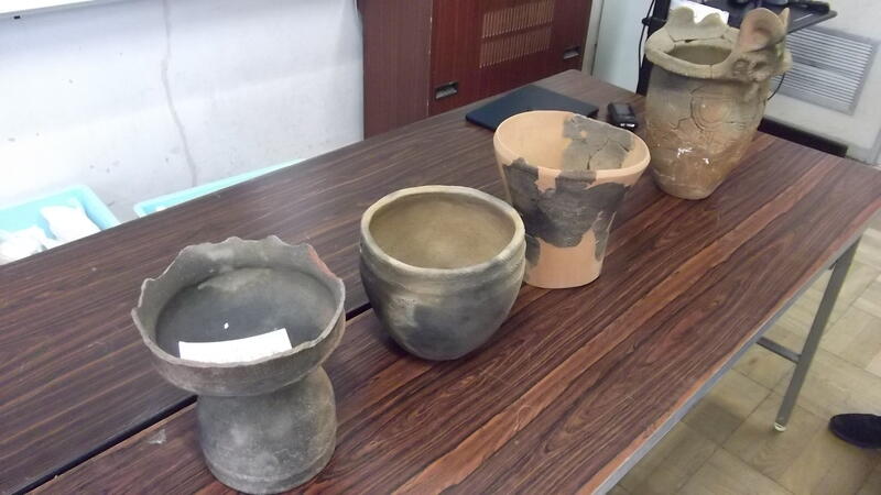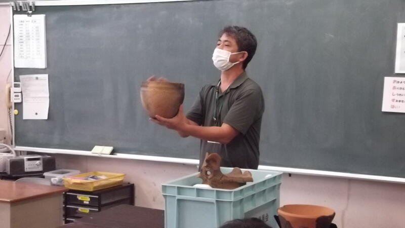 授業は、生徒からの質問に答える形で進みました。その中で、柏市内の遺跡から出土した土器や石器等の遺物も見せていただきました。先生のお話から、当時の生活について色々と知ることができました。