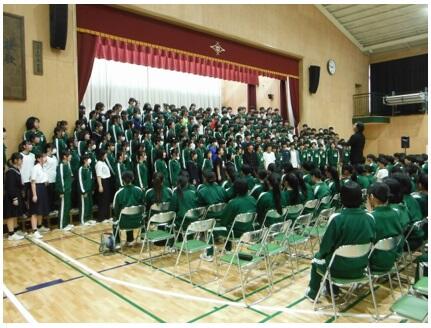 体育館に響き渡る力強い歌声とともに式が始まりました。全校生徒が心を一つにして校歌を歌いました。