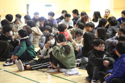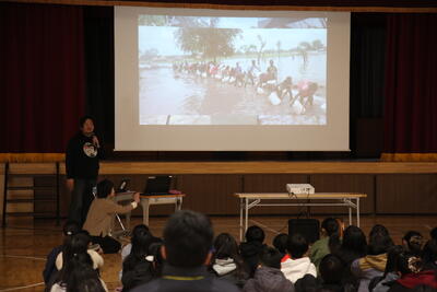 今日はなかよし学園の方にお越しいただき、カンボジア難民キャンプでの活動の様子を5年生は体育館。