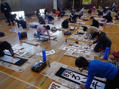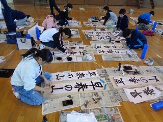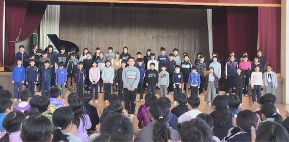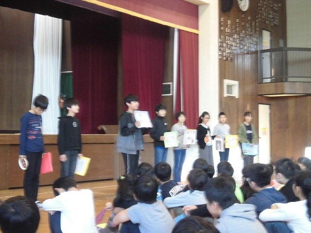 今月の歌「心の中にきらめいて」を歌った後,交通安全ファミリー作文コンクール,千葉県書き初め展書星会賞,校内書き初め展金賞,子ども県展特選と入選者の表彰を行いました。