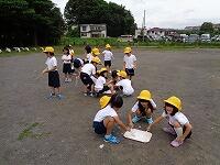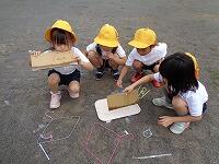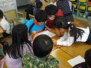 学校探検では,幼稚園生に教えてあげたいことをグループに分かれて考えました。けん玉や折り紙,1年生の生活体験やクイズなど,たくさんのアイデアを出し合って幼稚園生に教えてあげました。