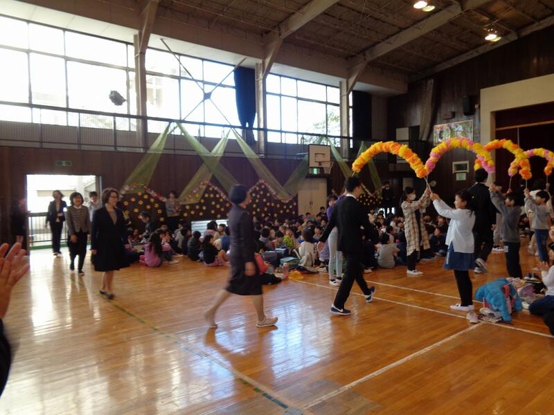 1年生は,6年生のお兄さんお姉さんと手をつないで笑顔で入場しました。
