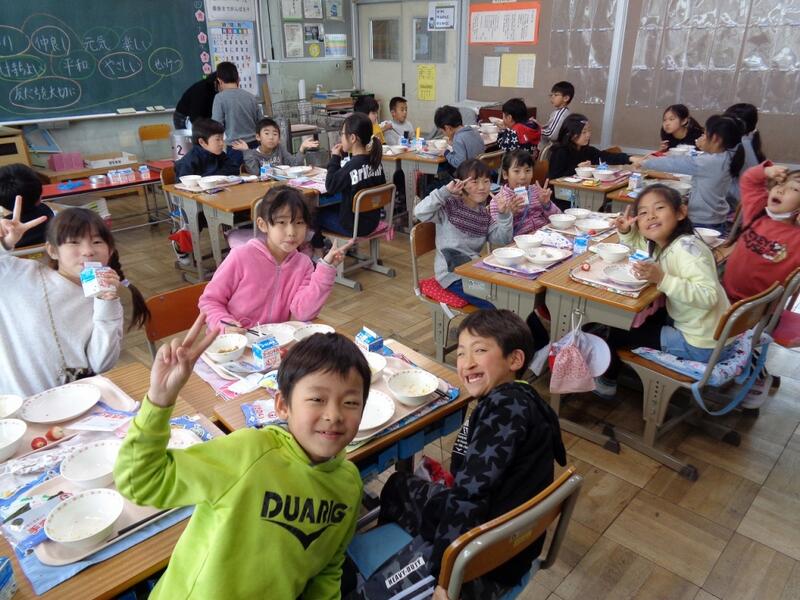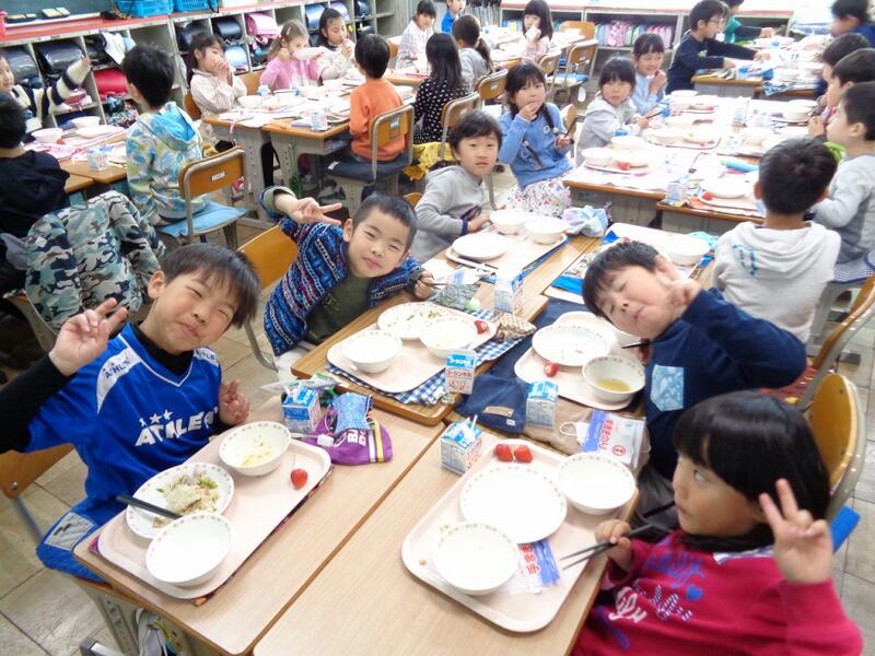 待ちに待った給食で,たくさんの笑顔がみられました。