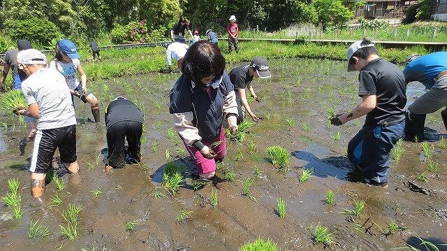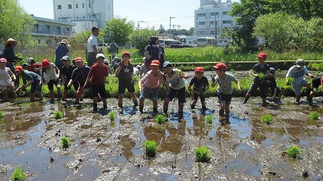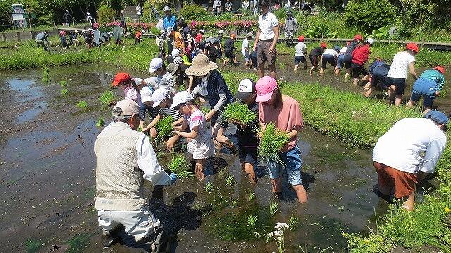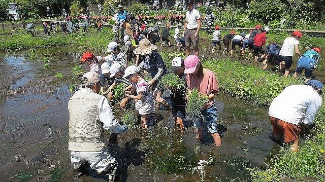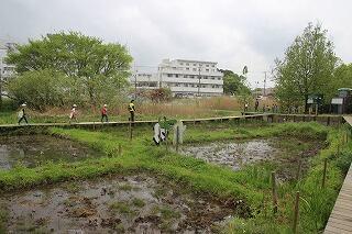 植える間隔や力の入れ方など,ビオトープ保存会の方々にたくさんのご協力をいただき,学びながら田植えを行うことができました。