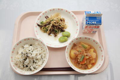1年生が剥いてくれたそらまめは給食で食べました。柏市産とのことです。美味しかったかな。