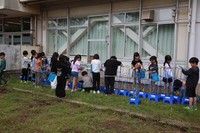 1年生は朝からせっせと水やりを頑張っています。ポットがプールになる位水を入れているので、やや心配になります。愛情たっぷりの朝顔を運動会の時にぜひ、ご覧ください。