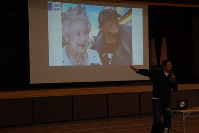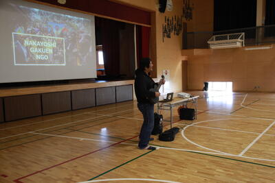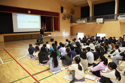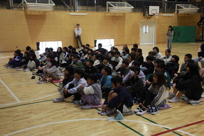 今日は、5年生が体育館でNPO法人なかよし学園プロジェクトの代表の方から世界平和について