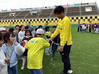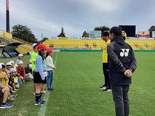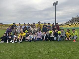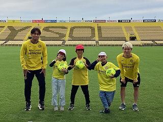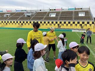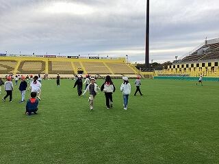 ここで、3回目のサプライズが!! なんと選手からサッカーボールのプレゼントをもらいました。各クラスで大切に使わせていただきます!! そのあと選手の2人と一緒に写真撮影をして、少し触れ合うことができました。選手とお別れをした後、さらにサプライズが!! 少し時間に余裕があったので、スタジアムの天然芝の上で遊ぶことができました。ふかふかの天然芝に驚き、思わず靴下になったり、裸足になったりする子もいました。スタッフの方曰く、試合中、選手が危険物でけがをしないようにと、ピッチを整備する際には細心の注意を払っているとのことでした。だから、「安心して裸足で走り回れますよ」とおっしゃっていました。見えない努力の先に、現在の強い柏レイソルがあるのだと感じました。こんな経験をすることができる子供たちをうらやましく思います。
