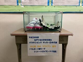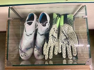 実は、名戸ケ谷小学校の卒業生に、柏レイソルU-18から海外のチームに移籍し、パリオリンピックの日本代表として活躍した小久保玲央ブライアン選手がいます。その小久保選手が、小学校時代に所属していたサッカークラブの監督さんを通して、小久保選手のサイン入りのスパイクとキーパーグローブをいただきました。現在、校長室前の廊下に展示しておりますので、ご来校の際にはぜひお立ち寄りください。