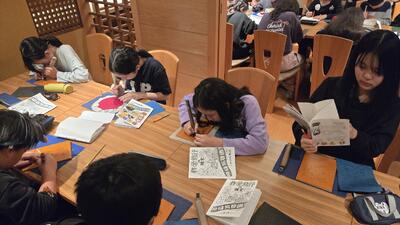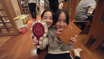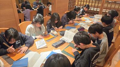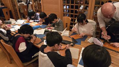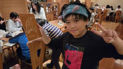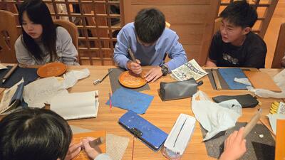 部屋長会が行われたのち、日光彫り体験となりました。下絵を事前に書いてきたので、トレッシングペーパーを使い、絵を写したあと、鍵彫りという独特の道具を使って彫りました。