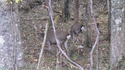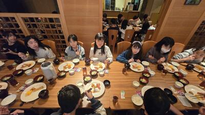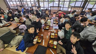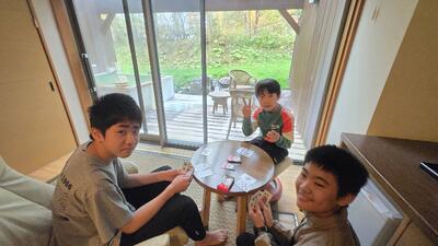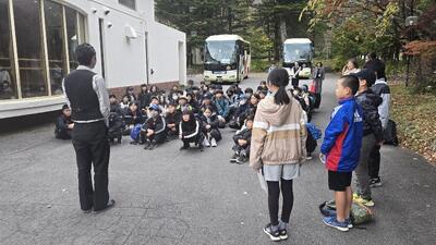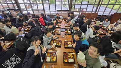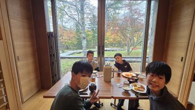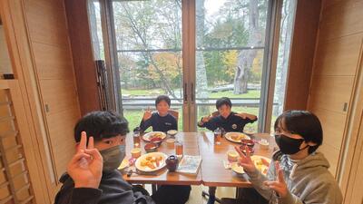 おはようございます。6年生の児童は元気に起きて、朝食を食べています。起床後、部屋の片付け中にフロントから道路側を覗くと、森の中で動くものが。。近付くと鹿の親子でした。朝の挨拶がてら、会いに来てくれました。