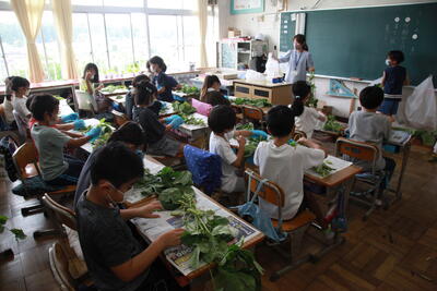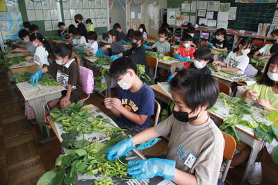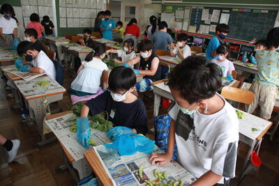 今日は給食で食べる枝豆のさやとりを4年生が行いました。