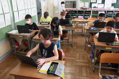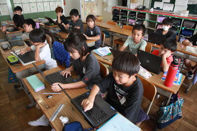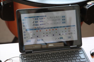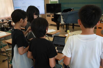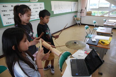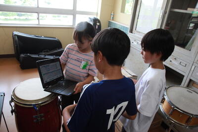 5年生はタブレットを使って作曲したのち、自分たちで楽器を決めて演奏しています。