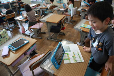 タブレットと教科書を同時に並べてもぶつからない広さに拡張できます。子どもたちの使用感を確認したうえで、今後、導入を検討していきます。