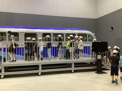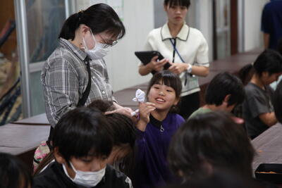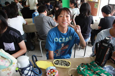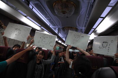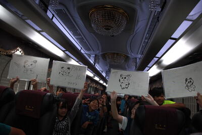 現地到着までバスレクをしながら気分を盛り上げて行きました。1段目の写真は、お題に対して、チームで一人5秒で描ける内容を足して、どのチームが上手に描けたかを競うゲームです。左の写真は「パンダ」右の写真は「校長先生)が題です。どのチームが優勝したでしょうか。