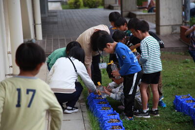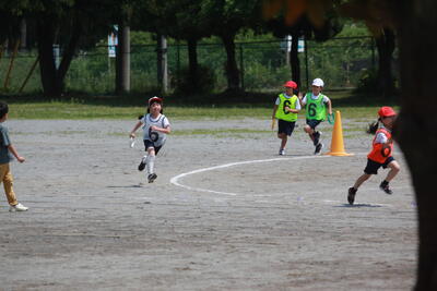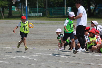 低学年のリレー練習の様子です。リングを落とさず、全員が完走しました。