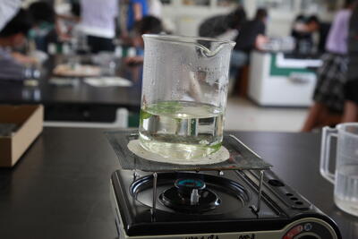 ガスコンロにビーカー及び試験管をセットし、煮たのち