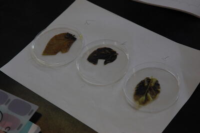 ジャガイモの葉がヨウ素液で染まる様子を観察しました。