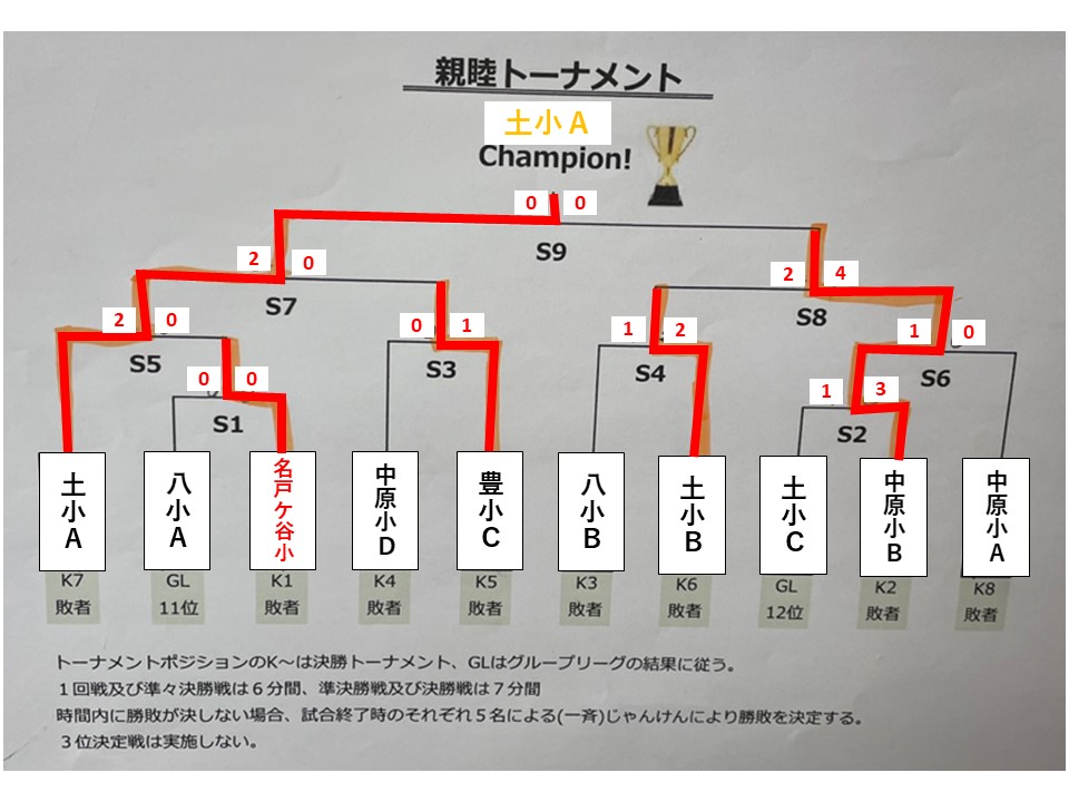 午前中の予選リーグ(名戸ケ谷小開催)は、4チーム中4位と最下位でしたが、全体で12位となりなんとか決勝トーナメントに進出!