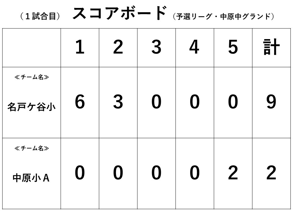1試合目は「中原小Aチーム」と対戦。名戸ケ谷小チームの強さは未知数でしたが、始まればみんな結構できる方ばかりで、乗ったらとめられない打線とかたい守りで9対2で勝利!(R061103スコアボード結果(予選リーグ・VS中原小Aチーム).jpg)