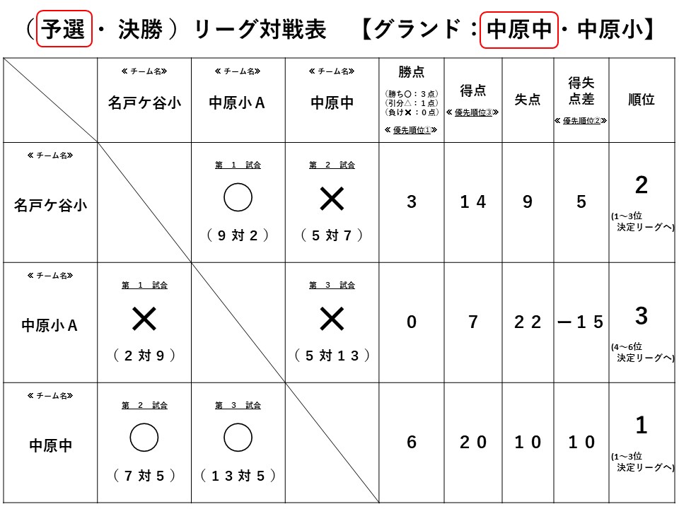 予選リーグは3チーム中2位でしたが、もう1つグランドで実施していた2位より得失点差が大きかったため、上位リーグ(1~3位決定戦)に進みました。(R061103対戦表結果(予選リーグ).jpg)