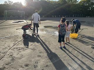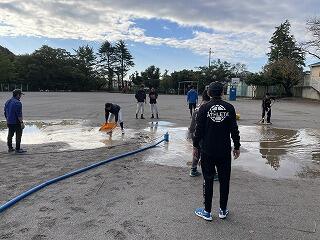 大会を始める前に、前日の大雨でグランドの水溜まりをみんなで整備しました。