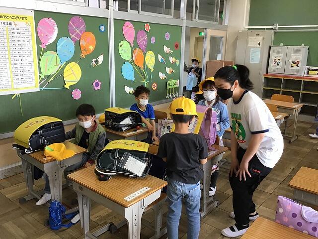 ピカピカの一年生が入学して一週間が経ちました。朝は6年生が支度の手伝いをしてくれています。