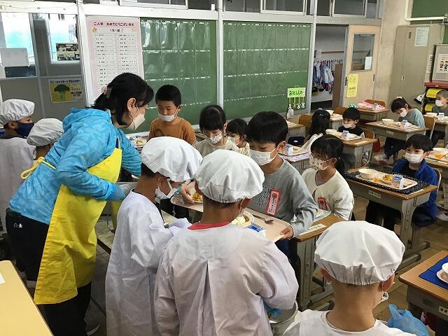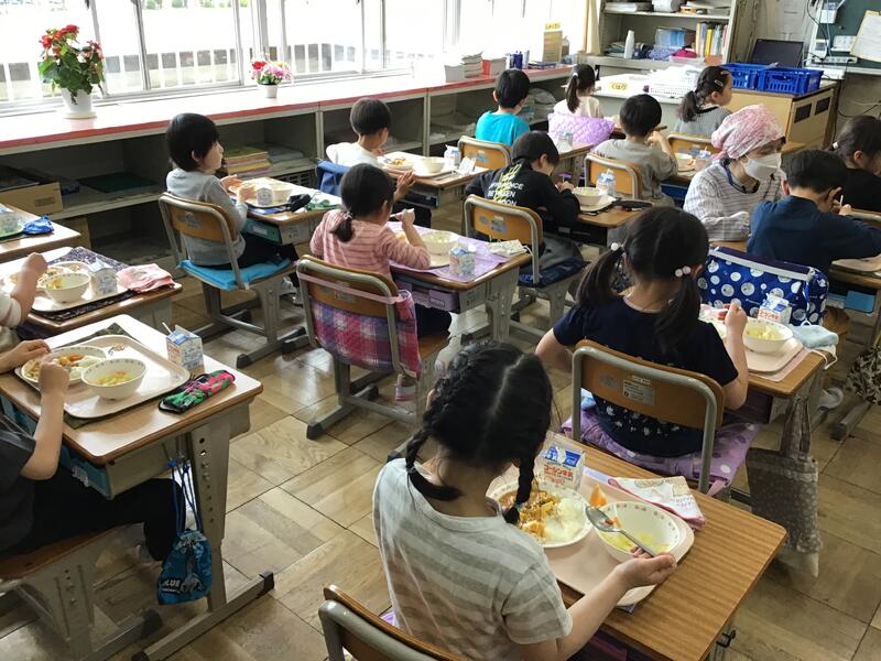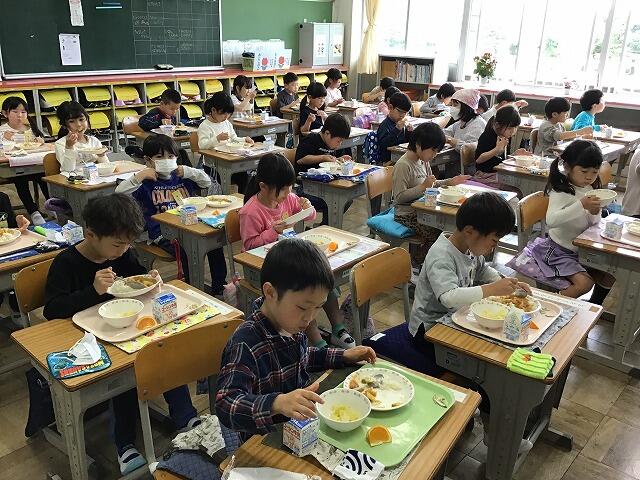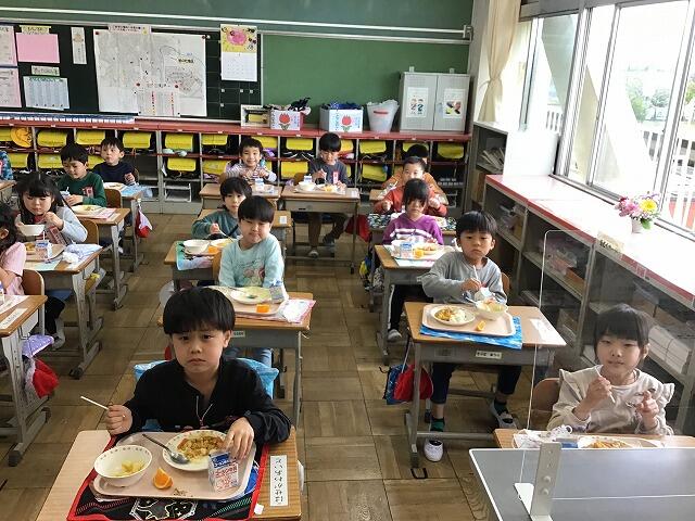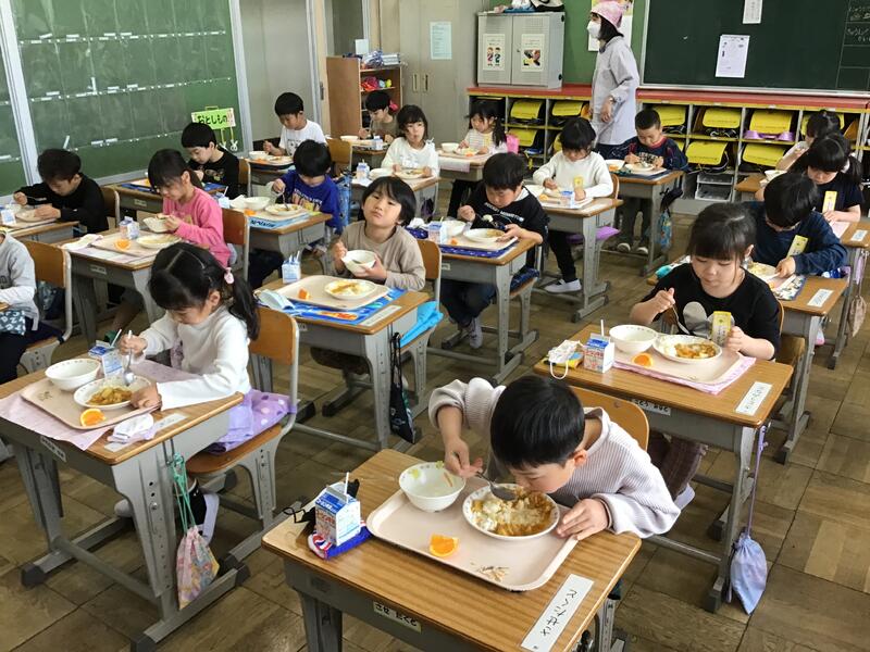 今日から給食が始まりました。給食当番も頑張っています。