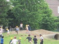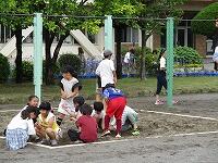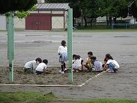 砂場で遊んでいます。「だるまさんがころんだ」をしているようです。