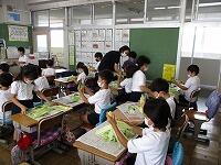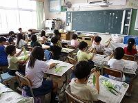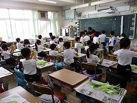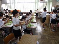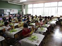 今日は、一昨日の4年生に続き、今度は、2年生が全校を代表して、給食の『とうもろこしの皮むき』をしました。皮のついた「とうもろこし」を渡すと、とてもうれしそうでした。同じように「とうもろこし」の様子をよーく眺めてから「皮むき」を始めていました。今日の「とうもろこし」は、柏市大井の農家の方が育てた「とうもろこし」です。全校分の120本の『とうもろこしの皮むき』です。