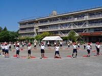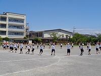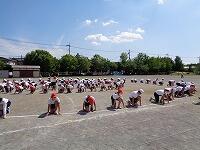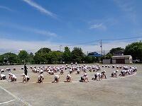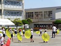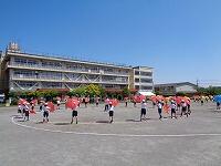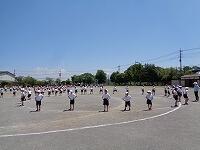 低学年は、大きな円の隊形で、体を動かしながら、内側を向いたり、外側を向いたりします。種目名は、「1、2、3、4 マスカット」です。