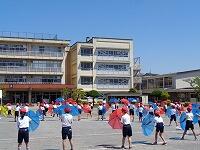 中学年の「表現運動」は、カラーのパラソルを使います。種目名は、「ARASHI」です。