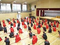 高学年の練習の様子です。黒と赤の衣装(はっぴ)を着て、ポーズが決まっています。