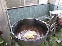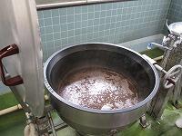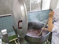 「よもぎだんご」のあずきを煮ています。あずきの柔らかさを確かめています。さとうを入れました。
